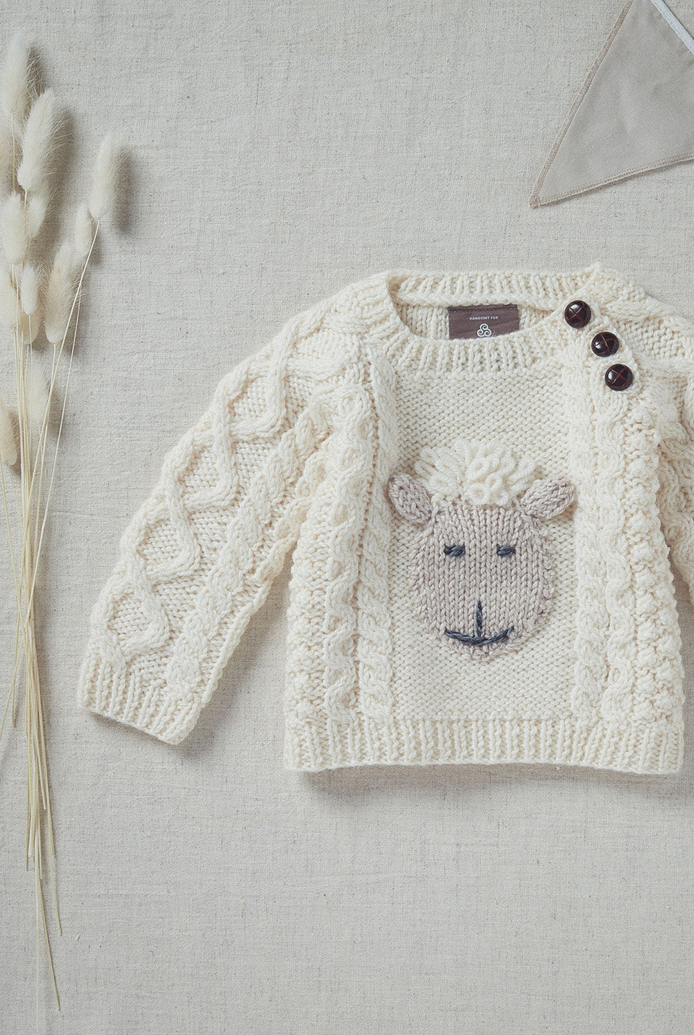 Carefully crafted with 100% Handknit Merino Wool, this sweater is soft to touch and gives off the most wonderful warmth for the little wearer. With three gorgeous, shanked football buttons, your baby’s first Aran is the perfect sustainable, statement piece.